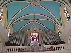 The building's exterior architecture is Neoclassical, while its interior is mostly colonial and Gothic.[12] The current structure is larger than the 1839 structure, having been extended on the south side in 1911 with the addition of the side chapel. It covers an area of 3,540 square yards (2,960 m2). The architecture of the cathedral is neoclassical in style with the exterior painted pale blue and gray and the interior in blue and beige.[15] The building has many stained glass windows depicting religious scenes and two bell towers.[16]