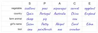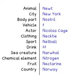 Categories is a word game where players attempt to list words that fit into particular categories, all starting with the same letter.[1] Players start by deciding on a list of categories between them, such as "town" or "actor",[2] and each writing that list on a sheet of paper. A letter of the alphabet is then chosen at random, and players have a set amount of time to write something for each category that starts with that letter.[1]