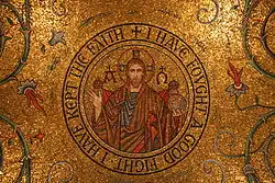 While the mosaics in the side chapels and sanctuary walls were designed and installed by Tiffany Studios, the mosaics in the main cathedral areas were designed by August Oetken.[6] Installation of the mosaics was completed by dozens of artisans, including Hildreth Meiere, Ravenna Mosaic, Inc., and especially the father and son team, Paul and Arno Heuduck, who worked on the mosaic for nearly their entire working lives,[12] and Emil Frei, Inc., of St. Louis.[6] The narthex of the church depicts the life of King Louis IX of France, namesake of the city and church, the rear dome includes mosaics of significant archdiocesan events, while the main dome by Jan Henryk de Rosen depicts Biblical scenes from both the Old Testament and New Testament.[7]