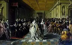 Catherine had ordered that at the Château de Fontainebleau, each important noble should host a ball. She herself held a banquet in a meadow at the château's dairy, where her courtiers dressed as shepherds and shepherdesses.[13] That evening, the court watched a comedy in the great ballroom, which was followed by a ball where 300 "beauties dressed in gold and silver cloth" performed a choreographed dance.[14]