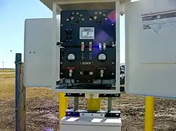 The DC power source would typically have a DC output of up to 50 amperes and 50 volts, but this depends on several factors, such as the size of the pipeline and coating quality. The positive DC output terminal would be connected via cables to the anode array, while another cable would connect the negative terminal of the rectifier to the pipeline, preferably through junction boxes to allow measurements to be taken.[21]