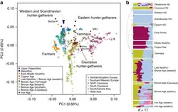 - ^ Irving-Pease, Evan K.; Refoyo-Martínez, Alba; Barrie, William; et al. (2024). "The selection landscape and genetic legacy of ancient Eurasians". Nature. 625 (7994): 312–320. Bibcode:2024Natur.625..312I. doi:10.1038/s41586-023-06705-1. PMC 10781624. PMID 38200293.