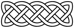 Examples of plait work (a woven, unbroken cord design) predate knotwork designs in several cultures around the world,[2] but the broken and reconnected plait work that is characteristic of true knotwork began in northern Italy and southern Gaul and spread to Ireland by the 7th century.[3] The style is most commonly associated with the Celtic lands and England (particularly the Kingdom of Northumbria) and was then exported to Europe by Irish and Northumbrian monastic activities on the continent. J. Romilly Allen has identified "eight elementary knots which form the basis of nearly all the interlaced patterns in Celtic decorative art".[4][5]