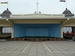 It was first called the New Bandstand, and then the Central Bandstand, to differentiate it from other bandstands in Herne Bay, especially the bandstand which stood on the roof of the King's Hall and has since been demolished. The north or seaward side of the Central Bandstand was built in 1924, with alterations in 1931.[5] The original architect was Herbert Kempton Dyson, M.I.Struct.E (1880–1944), who was a founder member of the Concrete Institute, and specialised in reinforced concrete structures.[3][6][7] The 1924 section has two outside seaward-facing balconies with space for deckchairs, including a cantilevered roof for the lower deck and for covering the stage inside. Metal, glazed screens at the east and west sides of the building crossed the promenade, and could be moved to protect the audience from wind, or retracted into the wings to allow promenaders to cross when no band was playing.[4][6] The seating area was a railed-off section of the promenade, and the seating on the roof above the stage included two copper-covered domes, plus two domes which doubled as refreshment kiosks.[4] The roof is now inaccessible for safety reasons.[4] By the late 1920s the audience area in front of the stage had extended across Tower Gardens to the edge of the footpath and road.[8]