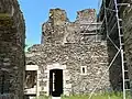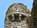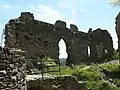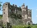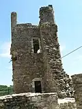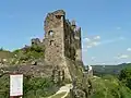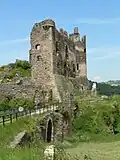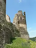 The "romantic ruins of Château Rocher",[2] standing on a cliff above the river, are the remains of a 13th-century construction, with evidence of earlier (11th century) building. The castle was built by the Lords of Bourbon. A masonry bridge crossing the moat leads to the entry door, now ruined, and the outer wall. A second wall existed in front of the two eastern towers. Three principal towers flanked the east and north fronts.[1]