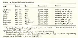About ten original chalumeaux are extant, but modern craftsmen produce replicas based on these original instruments. Of the original instruments, most are made of boxwood and all feature two keys placed opposite each other to be played by the thumb and first finger of the left hand. The mouthpieces of these instruments usually have the reed placed on top so that it vibrates against the upper lip when played.[4] The surviving chalumeaux were made between the beginning of the eighteenth century and about 1760 by five known instrument makers including J.C. Denner, W. Kress, Liebau, Klenig, and Muller.[4] Of these instruments, there is one soprano and one bass chalumeau, several tenor and alto chalumeaux, and one rare chalumeau d’amour (aka Mezzo-Soprano chalumeau). The chalumeau d’amour has a bulbous bell like its rare contemporary the clarinette d’amour (aka "Mezzo-Soprano Clarinet") and the modern-day English horn or "Alto Oboe".[3]