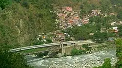 Located on the right bank of the Ravi river valley, built on successive flat terraces, the town is bounded topographically by the Dhauladhar and Pir Panjal ranges, south of the inner Himalayas.[18][20] Chamba, despite its hill location, is well connected by road to the rest of the state and country, including Shimla, Delhi and Chandigarh along several routes.[21][22][23] The nearest broad gauge railway stations are at Chakki Bank and Pathankot, the latter of which is 120 kilometres (75 mi) away by road.