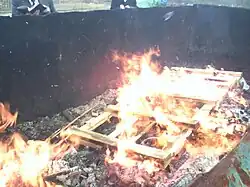 A small scale bi'ur chametz. Note the charred ashes of the lulav palm frond from Sukkot has been used for kindling to reuse a holy object to perform an additional mitzvah.