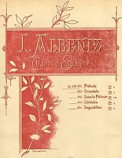 Chants d'Espagne, Op. 232, (Spanish: Cantos de España, English: Songs of Spain) is a suite of originally three, later five pieces for the piano by Isaac Albéniz. Prélude (later known as Asturias (Leyenda)), Orientale and Sous le palmier were published in 1892, and Córdoba and Seguidillas were added in the 1898 edition. According to Günter Schulze, "Many...[of the works] have the flavor of the flamenco so beloved of Albéniz."[1]