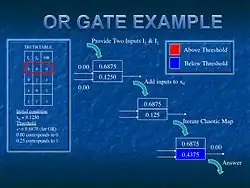 In this case, the value of x is chaotic when r >~ 3.57... and rapidly switches between different patterns in the value of x as one iterates the value of n. A simple threshold controller can control or direct the chaotic map or system to produce one of many patterns. The controller basically sets a threshold on the map such that if the iteration ("chaotic update") of the map takes on a value of x that lies above a given threshold value, x*, then the output corresponds to a 1, otherwise it corresponds to a 0. One can then reverse engineer the chaotic map to establish a lookup table of thresholds that robustly produce any of the logic gate operations.[1][2][3] Since the system is chaotic, various gates ("patterns") can be switch between exponentially fast.
