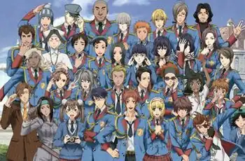 The members of Squad 7 in the anime, posing in front of the Edelweiss. From left to right: Jann Walker, Karl Landzaat, Edy Nelson, Homer Peron, Marina Wulfstan, Aisha Neumann, Emile Bielart, Alicia Melchiott, Welkin Gunther, Isara Gunther with Hans in her arms, Oscar Bielart, Susie Evans, Largo Potter and Brigitte "Rosie" Stark.