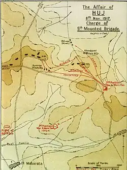 The Charge at Huj (8 November 1917), also known by the British as the Affair of Huj, was an engagement between forces of the British Empire's Egyptian Expeditionary Force (EEF) and the Ottoman Turkish Empire's,[nb 1] Yildirim Army Group during the Sinai and Palestine Campaign of the First World War. It took place during the Pursuit phase of the Southern Palestine Offensive which eventually captured Jerusalem a month later.