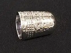 Horner's "Dorcas" thimbles were patented in 1884.[2][3] These solved the problem of the previous soft, silver thimbles by using a sandwich of strong steel and sterling silver layers. The three layers were formed separately, stacked together, and then a protruding lip of the inner silver liner was burnished over the steel, locking into place in a groove around the outer silver decorative layer.[3]