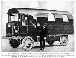 After discovering an 1867 treatise by John Tyndall that a small and regulated flame could be extinguished by a sound of the appropriate frequency, he claimed to have developed the technique to do this with his voice.[5] He was also a skilled craftsman and an inventor. In 1924 he designed and patented a mechanized fruit and nut picker.[9] He also designed a movable fireplace. Every time he visited his California home, he found that the forests were dwindling and along with his friends who included John Muir and John Burroughs he considered ways to highlight the loss. He "kept thinking and thinking through many years how to take the forest out to the world ...[since] the world could not come out to the forests". After World War I he saw a powerful truck, a Nash Quad and decided to modify it by adding a body made from a 7 metre section of a redwood and carving it out with a bed, a toilet and a kitchen with cupboards. The wood weighed 3 tons and could not be lifted. He then dug a tunnel under the wood and drove the Nash Quad under it and then had the log body lowered onto it. He called his vehicle the "Travel Log" and drove it around at a maximum speed of about 8 km/hour. In later years he traveled in a lighter vehicle that he called the "Bird Wing" - something that he claimed would start when he whistled to it.[5] He traveled at various times to the West Indies and Fiji where he observed a fire-walking ceremony. He also traveled to Paris where he met Auguste Rodin.[10]