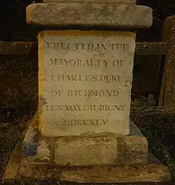 Base of commemorative obelisk erected in Chichester with inscription for the Duke's mayoralty & his part in the Jacobite uprising