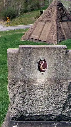 An associate of Russell stated that Russell's body at age 64 was more worn out than that of his father who died at age 84.[66] He was buried outside of Pittsburgh in United Cemetery, Ross Township, Pennsylvania. The gravesite is marked by a headstone. Nearby stood a 7-foot-tall (2.1 m) pyramid memorial erected by the Watch Tower Bible and Tract Society in 1921.[67][68] The pyramid memorial was vandalized and subsequently removed in September 2021.[58]