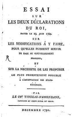 From 1792 he published several politic pamphlets defending the borbonic monarchy against the power of the Etats Generaux.[5] During the Napoleonic period he remained in exile and, probably, acted as an agent of the Allies against France. The intransigence of his political views is evident in the dozen of political writings published between 1792 and 1805.[2]
