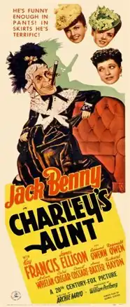 Charley's Aunt is a 1941 American historical comedy film directed by Archie Mayo. It stars Jack Benny and Kay Francis. It was the fourth American filmed version of the 1892 stage farce of the same name by Brandon Thomas. It remained one of Benny's personal favourites among his own films.[2][3][4]