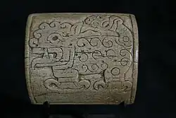 One other ritualistic element included the use of psychotropic drugs through mescaline containing cacti. The cacti provided a psychedelic drug that caused a lot of sensory overloads. It has been displayed in art, specifically ashlar blocks with costumed figures in procession carrying the cacti.[14] Ritual evidence in the architectural remains shows that there was paraphernalia for grinding and ingesting snuff.[14] Artistic evidence shows that certain drawings were done by shamans whilst under the influence of the psychedelic drugs.[14]