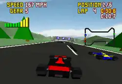 There are three different modes of play to choose from at the options screen: Single Race, Free Practice and Tournament.[2][4][5][6] Single Race is a race mode where players compete against computer-controlled opponents on any track and complete a number of laps.[2][4] Free Practice is a time trial mode, where players race against the clock to achieve the best time possible and practice their driving skills.[2][4] Tournament is a season mode where players compete against five opponents to reach the first place across ten different tracks.[2][4] There are no multiplayer modes.[1][8]