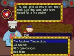 In the game, the player takes the role of one of four characters: Eric Cartman, Kenny McCormick, Kyle Broflovski, or Stan Marsh in a game show hosted by Chef.[4] The game intermittently switches between questions and mini-games, with a mini-game preceding every three questions. Players score points by correctly answering questions and mini-game ranking. Players lose points for questions answered incorrectly. The game is exclusively multiplayer; when played by one player, there is no AI, so that player always wins, even with a negative score. Players have the option to "shaft" (pass on) a question to another player after opting to answer the question. The "shafted" player can then pass the question on again or choose to answer the question. When "shafting", a question will always be answered by the last player to be "shafted".