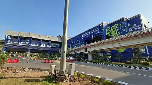 NLC India Airport Metro (formerly known as Chennai International Airport) is an elevated southern terminal metro station on the North-South Corridor of the Blue Line of Chennai Metro in Chennai, India. This station serves the Chennai International Airport and the neighbourhoods of Nanganallur, Meenambakkam, Tirusulam, Pallavaram, Pammal, Kundrathur and Tambaram. The station is the only elevated airport metro station in India. The other airport metro stations in the country such as those in Delhi, Lucknow, Mumbai and the proposed ones at Bangalore and Hyderabad are underground.[2] The station enables rapid transit connectivity with the airport, making Chennai the second city in India after Delhi to achieve this.[3]