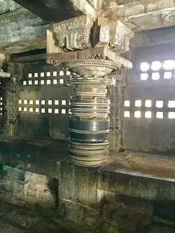 The mandapa (hall) is supported by lathe turned pillars.[39] The pillars, except two of them, are of the same size. All of them, except four in center, have five mouldings from common life themes stacked in sequence: disc, bell, pot, wheel and umbrella. The four set of central square pillars of the Navaranga have yakshas and brackets, which have been damaged or have disappeared. The two pillars to the east of the central square are shaped as a 32 pointed-star.[38][39]