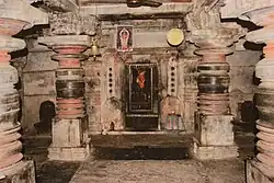 The temple has all the basic elements of a standard Hoysala temple and comprises a sanctum which is connected to a closed hall by a square vestibule (sukhanasi). The entrance into the hall from the outside is through a porch (mukhamantapa). Typically, a closed hall in a Hoysala temple has no windows. The porch consists of an awning supported by two decorative half pillars with two parapets on both sides. The shrine has a tower (called shikhara). The vestibule has its own tower (also called sukhanasi) which appears like a low extension of the main tower over the shrine. Art critic Gerard Foekema calls it the "nose" of the main tower. From the outside, the walls of the vestibule are inconspicuous and appear like a short extension of the shrine wall.[4][5][6] The ceiling of the closed hall is supported by four lathe turned pillars. These pillars divide the ceiling into nine highly decorated bays.[5] Between full pilasters, the outer walls of the hall and shrine are decorated with turrets and miniature towers on half-pilasters (aedicula). Below these, forming the base of the temple, are the five horizontal moldings.[7]