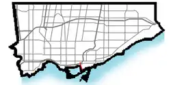 During the 2015 Pan American Games and Parapan American Games thousands of athletes were housed in a temporary athlete's village just east of the intersection of Cherry and Front streets.[4] Temporary pavilions were built on a large vacant lot on the southwest corner of Cherry and Front which served as the athletes' dining area, as well as a temporary bus marshalling yard for the fleet of rented buses which carried athletes to their venues.