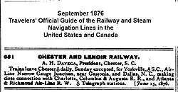 In 1873, the Chester and Lenoir was chartered through the consolidation of the Kings Mountain Railroad and the Carolina narrow gauge railroad company.[1][2] The previous line had lay abandoned for several years until it was acquired by the Chester and Lenoir.[3]