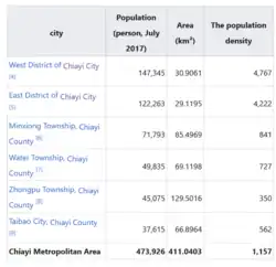 According to the definition of metropolitan areas formerly used by the Republic of China government, the Chiayi metropolitan area includes the following areas:
