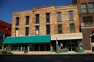 The Chick House's design is simple and utilitarian, reflecting its construction for use as a hotel. The three-story brick structure's 66 foot (20.1 m) east facade faces Main Street and its 149-foot (45.4 m) south facade faces toward Elm Street. The building incorporates elements from Greek Revival and Italianate styles and presents itself as an architectural "antithesis" to the adjacent Richardson Romanesque Stewart Building.[3] The Chick House originally has an "L" shape but additions during the 1890s, 1900s and in 1932 partially filled in the rear of the building, which faces toward an alley.[3]
