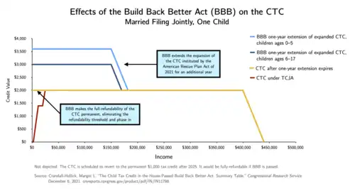 The Build Back Better Act, passed by the House of Representatives on November 19, 2021,[65] would extend the expansion of the CTC made by the American Rescue Plan Act of 2021 for one year.[66] Significantly, it would also make the full-refundability of the CTC permanent (i.e. it would permanently eliminate the earned income threshold and phase-in, so that low-income families can access the full value of the credit).[20] The bill stalled in the Senate[67] and was ultimately replaced by the Inflation Reduction Act of 2022, which did not include an expansion to the child tax credit.