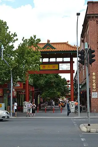 Chinatown in Adelaide, South Australia, Australia, also called Adelaide Chinatown (Chinese: 阿德雷得唐人街) or Moonta Street Chinatown, is located on Moonta Street, within the large Adelaide Central Markets precinct between Grote and Gouger streets in the Adelaide city centre. Two large Paifang, which were erected by the city council, are guarded by the Chinese guardian lions.[1] They mark the entrances at either end. Adelaide Chinatown consists mainly of Chinese restaurants, grocery stores and markets but also consists of many non-Chinese Asian restaurants offering cuisines of Indian, Japanese, Korean, Malaysian, Nepali, Thai and Vietnamese origins.[2][3]