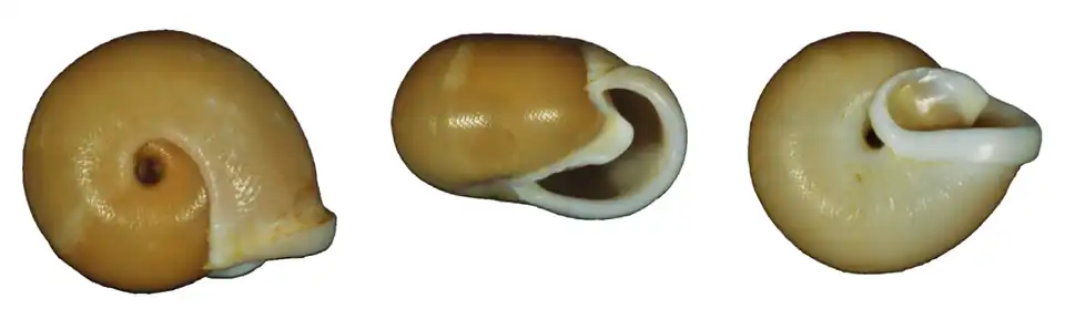 Shell is solid, of a light ochre color, biconcave, regularly striated with very fine axial riblets, with numerous periostracal hairs (visible in this well cleaned sample as hair pits), covering the whole surface.[1] The spire is deeply sunken, with 3¾-4½ whorls.[1] Whorls are rounded, first whorls very narrow, the last one very large, and embracing the preceding one, distinctly descending in front.[1] The umbilicus is deep, and very small (about 1/20 of the width of the shell) and partly hidden by the expanded columellar side of the peristome. The aperture is crescent, a little oblique. The peristome is very thick and expanded all around and somewhat reflexed.[1] The two ends are connected by an extremely thick callus, forming a very strong and quite sharp arcuate tooth on the body of the penultimate whorl.[1]
