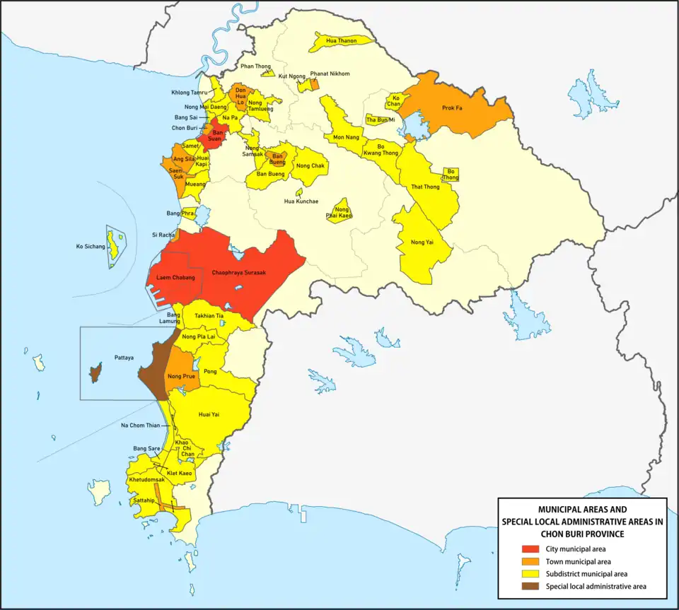 There is one Chonburi Provincial Administrative Organisation - CPAO (ongkan borihan suan changwat chonburi, อบจ.ชลบุรี). There are 49 municipalities, which are divided into 2 city municipalities (thesaban nakhon), 10 town municipalities (thesaban mueang) and 37 subdistrict municipalities (thesaban tambon).[6] Further for the local communities, which are not connected to a thesaban, there are 46 subdistrict administrative organisations - SAO (ongkan borihan suan tambon).[1][7] All mayors, chiefs and councillors are directly elected by the local citizens.[4] Municipalities have communities (chumchon), although not directly chosen by the local citizens, which provide advice and recommendations to local administrative organisations. They also promote and support community participation and enterprises at the district level and subdistrict villages.