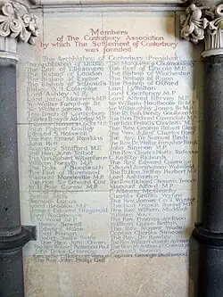 The cathedral contains the throne and memorial to Bishop Harper, the first Bishop of Christchurch and the second Primate of New Zealand, who laid the foundation stone in 1864 and preached at the consecration service in 1881.[44] In the west porch are stones from Canterbury Cathedral, Christchurch Priory, Tintern Abbey, Glastonbury Abbey, Herod's Temple, St Paul's Cathedral and Christ Church, Oxford.[45]