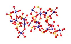 Structure of solid Cr(SO4)(H2O)(OH), showing the CrO6 coordination sphere typical of many chromium(III) compounds. Color code: red = O, yellow = S, dark blue = Cr.