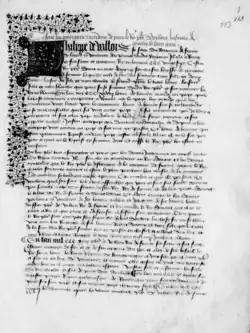 The Chronique des quatre premiers Valois is an Old French chronicle covering the years 1327–1393. This corresponds to the reigns of the French kings Philip VI, John II, Charles V and Charles VI, the first four kings of the House of Valois. The chronicle ends with Charles VI's madness.[1] It is known from a single manuscript copy of the 15th century, now in Paris, Bibliothèque Nationale de France, Français 10468.[2] The Chronique was ignored from its completion until the discovery of the manuscript by Siméon Luce, who published an edition in 1862, supplying it with the title by which it is now known.[3]