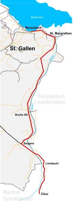 The Chur–Rorschach line is an important rail link in the canton of St. Gallen. It runs through the Chur and St. Gallen sections of the Rhine valleys from Chur to Rheineck and on to Rorschach.