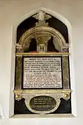 There is a monumental brass to Richard Golden (died 1446), priest at Willian 1416–1466,[4] while the walls are adorned with good quality monuments, those in the chancel being to Edward and Joan Lacon (died 1625 and 1624), John Chapman (died 1624) and Thomas Wilson (died 1656).[6] The latter is a fine and rare example. These monuments were cleaned and some were repainted in 1974. The newer of the two lecterns was given in memory of Samuel Valentine, who died in 1974; the older one was given in 1870 by Thomas Legh Claughton, the Bishop of Rochester in whose diocese Willian then lay.[4] The original 15th-century rood screen has been removed.[3][7] Above the tower arch are the Royal Arms which were probably placed there during the restoration of 1870. At the base of the tower the Ellacombe Chime bell-ringing apparatus on the wall enables one person to ring all six bells. The oldest bell in its original state is dated 1662. The organ was made by J. W. Walker & Sons Ltd in 1864, and was refurbished in 1986. The Victorian baptismal font is believed to be the fourth in the church. Its predecessor was taken to the Rectory where it was used as a plant container.[4]