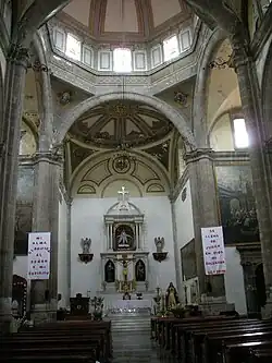The interior is rectangular with three naves. Six sculpted Neoclassical columns support the main nave, with arches supporting other parts of the building.[2][3] The roof is formed by barrel vaults with lunettes in the three main areas of the central nave. The cupola is in the shape of an octagon. Above the presbytery, there is another vault and a roof formed by eight small barrel vaults. The floor is done in mosaic, red and white in the main nave with green and white in the presbytery and a marble staircase. Eight windows line the side walls and eight are in the cupola, allowing in a large quantity of natural light.[3]