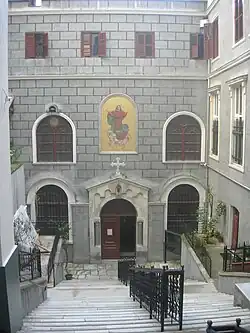 In 1453, a few months before the Ottoman Conquest of Constantinople, Observant Franciscan Friars completed the construction of the church of Saint Anthony of the Cypresses (Italian: Sant'Antonio dei Cipressi) in Sirkeci (at that time center of the venetian Merchants in Constantinople), on the southern bank of the Golden Horn, but soon after the Conquest they were forced to abandon it.[2] After several peregrinations, in 1584 they moved to Galata, in the neighborhood of Mumhane (English: Candle workshop), where a Levantine woman, Clara Maria Draperis, endowed them a house with a tiny chapel.[2][3] The altar of the chapel was adorned with a wooden icon portraying the Virgin Mary. The chapel burned completely in 1660, and the icon was rescued by a member of the Draperis family.[2] In case of total destruction because of fire, Ottoman law imposed the restitution of the land to the State.[4] Because of that, in order to rebuild the church the friars should have first asked for a Sultan's Firman allowing the reconstruction, but in absence of that the just rebuilt church was demolished in 1663 by the Ottoman government.[2] The friars then abandoned the neighborhood and settled uphill in Pera, in a place named Dörtyol (four roads).[2] They built there in 1678 a new church, which burned in 1697, was rebuilt and destroyed again by the strong earthquake of 1727.[2] Erected once again, the edifice burned for the third time in 1767 and was finally rebuilt for the fifth time in 1769.[2] After each catastrophe the icon of the Virgin could always be rescued, and embellishes still today the main altar.[2] Together with St. Anthony of Padua, also on Istiklal Caddesi, and SS. Peter and Paul in Galata, the church was one of the three Catholic parishes in the Levantine quarter of Istanbul. During the 19th century S. Mary became one of the most prestigious Catholic Churches in the city. In 1803 its parish had a flock of 470 Levantines, plus several Arab Catholics from Aleppo and Armenian Catholics.[5]