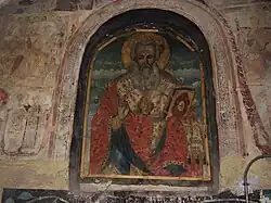 An icon of Saint Athanasius in the patron niche in the western facade of the church