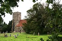 In the churchyard is a 3-[4] 4,000 year old[5][6] Yew tree (Taxus baccata) in the village was among the Great British Trees list that included 50 trees selected by the Tree Council in 2002 to spotlight trees in Great Britain in honour of the Queen's Golden Jubilee. The tree is growing on the top of a Bronze Age Bowl barrow. It is no longer one solid tree having divided into seven separate trunks in a circle with a diameter of 42 feet (13 m).[7]