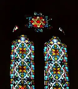 The western aisle-end windows are alike. The stonework of the apex of each window on the outside is in the form of a Canterbury cross. The coloured glass around the cross is painted with a stylised sunburst. The two large lights forming the main part of the windows have no coloured glass, allowing full light, especially on the font in the south aisle.[15][23] The west window consists of two sets of two lights. The small rose light in the right-hand window has the Star of David, and the rose in the left-hand window has the IHS symbol, derived originally from the first three letters of Jesus' name in ancient Greek, but usually translated as "Christ the Redeemer". This window was made by Cox and Son,[24][25] and paid for by the rector of Ripley, Reverend T.C. Thompson.[1][15][23]
