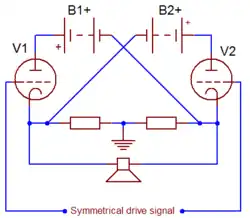 The electrical bridge of a circlotron is formed by a matched pair of triodes (V1, V2) and two floating power supplies ('B batteries'), B1+ and B2+. Grids of each triode are driven in opposite phases with a balanced, symmetrical input signal; differential current flows through the loudspeaker load and a simple, relatively high impedance, resistor network that ties floating supplies to the ground. Tubes are usually fixed biased with an external negative power supply ('C battery'); each side normally has independent bias adjustment to compensate for minor tube mismatch.
