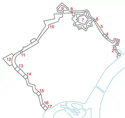 1. Porte Maghin, 2. Porte Saint-Léonard, 3. Bastion Saint-Léonard, 4. Porte de Vivegnis, 5. Rempart des Six-Cents-Degrés, 6. Païenporte, 7. Citadel, 8. Porte Sainte-Walburge, 9. Bastion du Clergé, 10. Bastion des Anglais, 11. Hocheporte, 12. Bastion du Saint-Esprit, 13. Porte Sainte-Marguerite, 14. Porte Saint-Martin, 15. Tour des Moxhons, 16. Porte des Bégards, 17. Tour des Bégards.