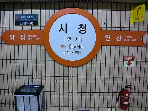 City Hall Station (Korean: 시청역; Hanja: 市廳驛) is a Busan Metro Line 1 station in Yeonsan-dong, Yeonje District, Busan, South Korea.