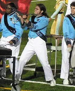 In music, a whip or slapstick is a clapper (percussion instrument) consisting of two wooden boards joined by a hinge at one end. When the boards are brought together rapidly, the sound produces a sound reminiscent of the crack of a whip. It is often used in modern orchestras, bands, and percussion ensembles.